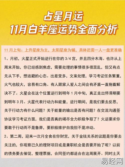 易经网推荐2025最新白羊座十一月综合运势 白羊感情复合运势最新是什么意思?,最新生肖运势,下面是详细内容: 2024年11月,白羊座将迎来充满活力和挑战的一个月。无论是在事业、爱情、财运还是健康方面...