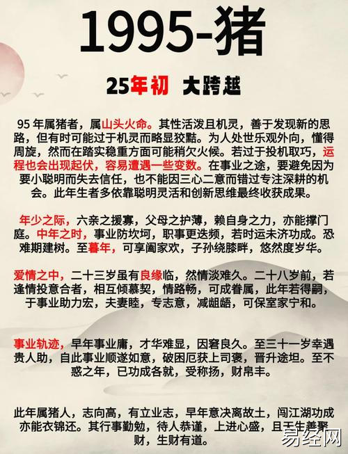 易经网推荐2025最新95年属猪女一生事业 95年属猪女今年姻缘状况是什么意思?,最新生肖运势,下面是详细内容: 属猪的女性,出生于1995年,通常被认为是温和、友善且富有同情心的人。她们在职场上的发展...
