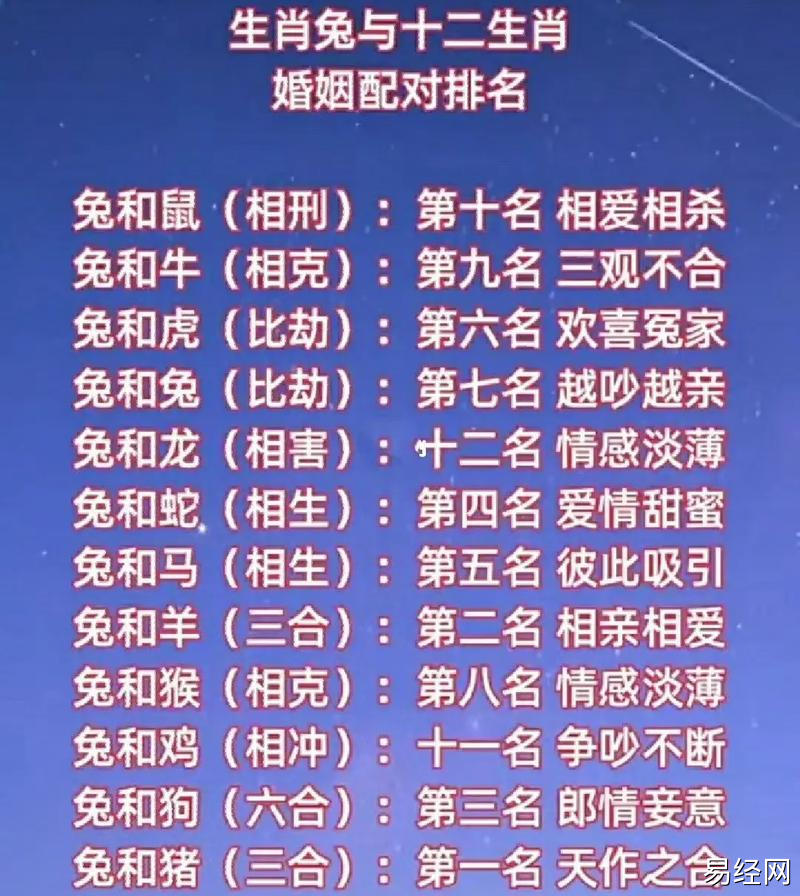 易经网推荐2025最新十二生肖属兔感情配对指数 十二生肖属兔最佳姻缘配对是什么意思?,最新生肖运势,下面是详细内容: 生肖兔,温婉柔顺,心思细腻,在情感世界里如同狡兔三窟,谨慎探索,渴望一段安全...