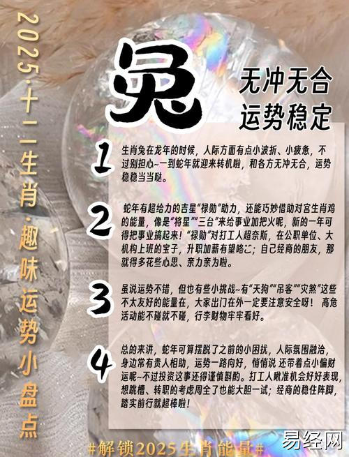 易经网推荐2025最新2025属兔的全年每月运势 2025属兔的每月运势是什么意思?,最新生肖运势,下面是详细内容: 2025年,农历乙巳年,对属兔之人而言,机遇与挑战并存。务必保持谨慎乐观的心态,方能乘势...