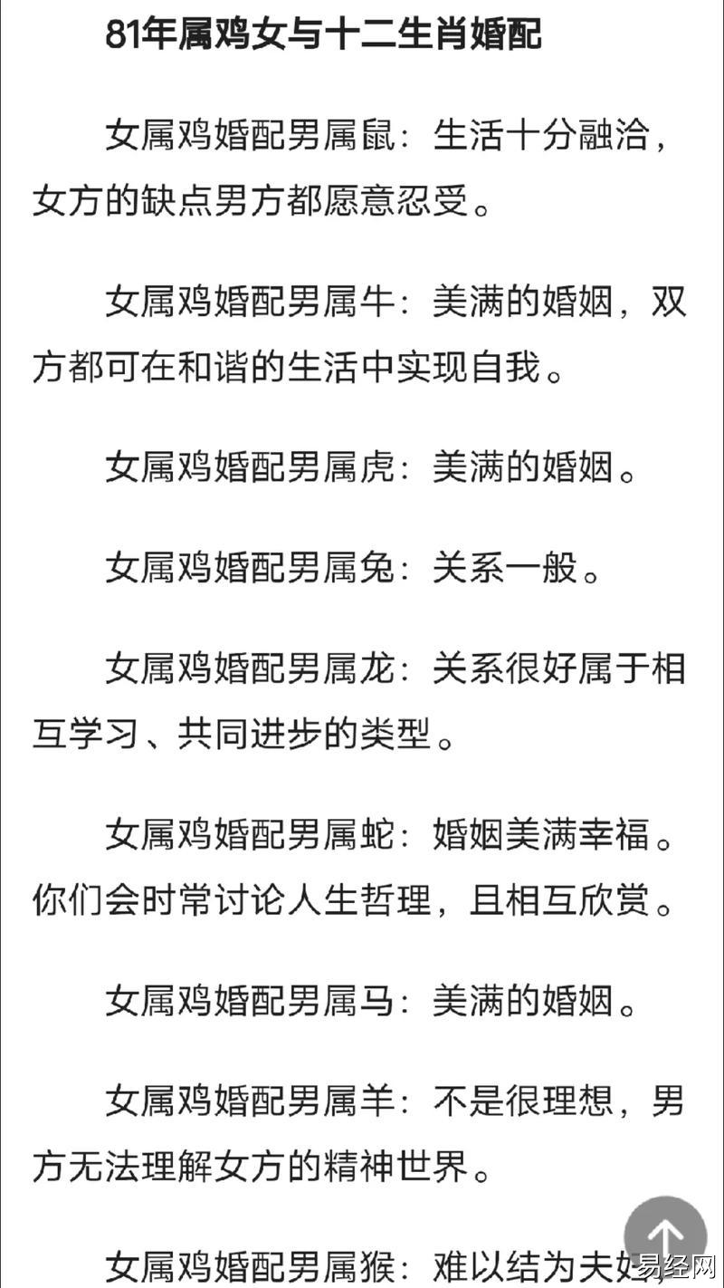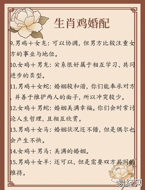 易经网推荐2025最新关注属鸡运势如何看婚姻 属鸡个人姻缘运势是什么意思?,最新生肖运势,下面是详细内容: 属鸡之人,五行属金,生性聪颖,口齿伶俐,在人际交往中往往如鱼得水。婚姻大事并非仅凭个人...