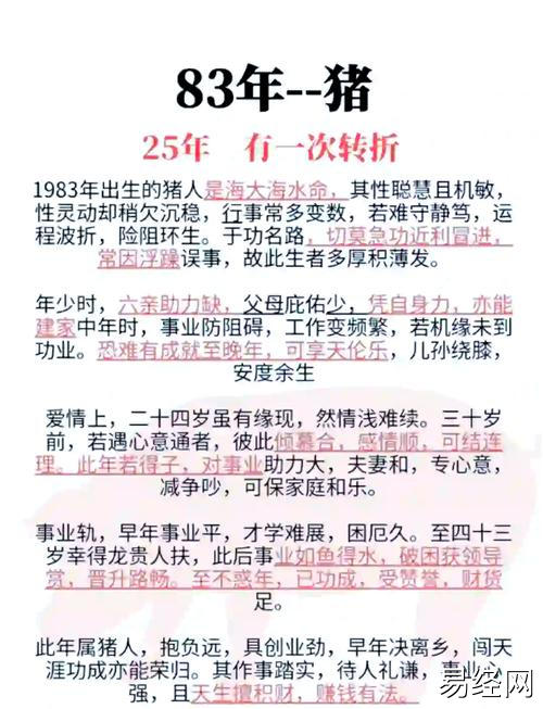 易经网推荐2025最新83年属猪女人婚姻命运如何呢 83年属猪女性婚姻运是什么意思?,最新生肖运势,下面是详细内容: 对于1983年出生的属猪女性来说,婚姻命运是一个充满独特魅力与复杂性的主题。这一年...