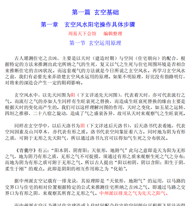 01中州派【玄空风水】第一篇+玄空基础.pdf第一章 玄空风水阳宅操作具体步骤 周易天下会馆 编辑整理 第一节 玄空运用原理 古人堪测住宅之吉凶,主要是以天时(建造时期)与空间(住宅朝向)的配合,根 ...