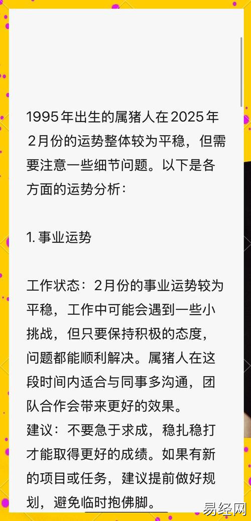 易经网推荐2025最新1995属猪女2025的运势 2025属猪女最旺饰品是什么意思?,最新生肖运势,下面是详细内容: 在生肖文化中,属猪的人以其温和、宽厚的性格受到人们的喜爱。1995年出生的属猪女,正步入她...