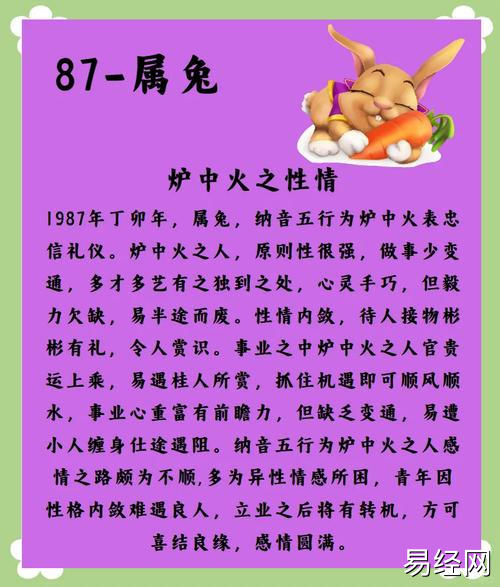 易经网推荐2025最新19配年属兔的婚姻 2025适合属兔的首饰是什么意思?,最新生肖运势,下面是详细内容: 1987年出生的属兔之人,生于丁卯年,纳音为“炉中火”,性格温和善良,心思细腻,追求安稳和谐的生...